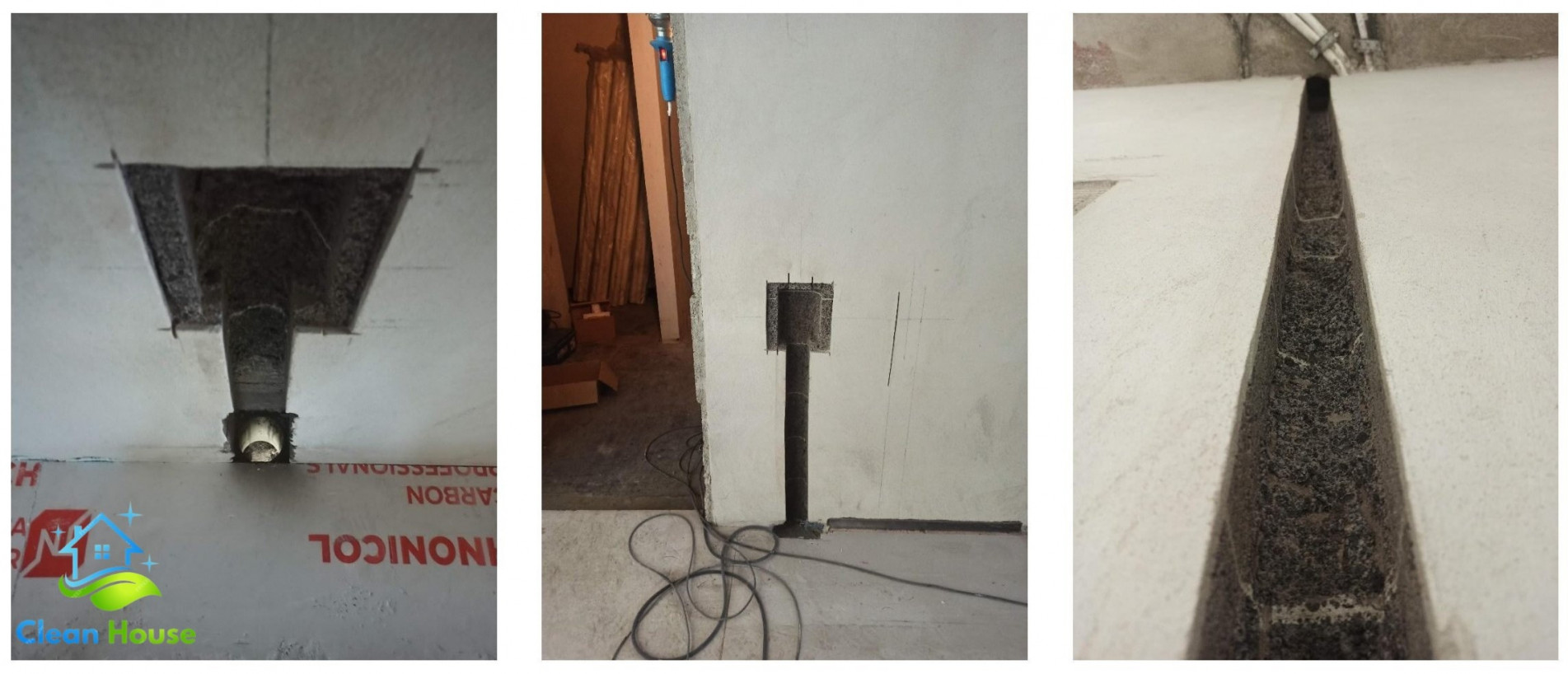 Имея в распоряжении проект пневмомагистрали или план расположения точек встроенного пылесоса, можно приступать к монтажу системы. У каждого строителя свои методики, приемы и привычки, здесь же мы опишем алгоритм и технологии монтажа централизованной системы пылеудаления, которых придерживаются наши специалисты. Зайдя на объект, в первую очередь следует «прочертить в голове» будущую магистраль и убедиться, что на участках штробления нет скрытой проводки, в точках сверления через стены и перекрытия нет канализации и т.д. Убедившись в безопасности проведения демонтажных работ, можно приступать к сверлению и штроблению стен и перекрытий.